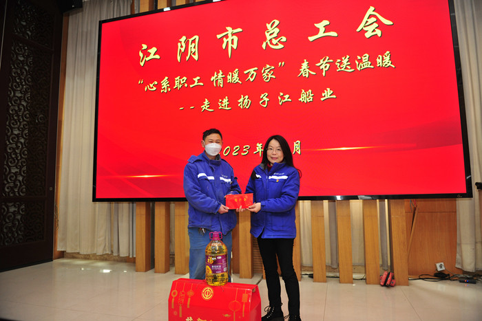 新?lián)P子造船總經(jīng)理助理茆宏兆為12月申請員工互助幫困基金的會員職工送上基金會的慰問。新?lián)P子造船總經(jīng)理杜成忠為困難職工送上慰問金和年貨。傾聽他們生活上的困難和對工作環(huán)境等方面的意見,寬慰他們困難只是暫時的,關(guān)鍵不能失去戰(zhàn)勝困難的信心,在自己的努力和公司多方位的關(guān)懷下,一定能夠走出困境,迎來美好生活。同時,杜總還為大家送上了新春祝福,祝愿大家闔家幸福、新春快樂!揚子鑫福造船黨支部書記陳金爐、工會主席陳紅代表公司和工會為困難職工送上慰問金和慰問品。揚子三井造船黨支部書記鄭紅星、工會主席司凌鈺代表公司和工會為困難職工送上慰問金和慰問品。