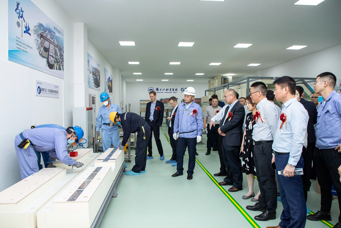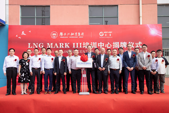 9月26日上午,揚子江船業集團LNG MARK III培訓中心揭牌儀式在揚子鑫福造船舉行。達飛公司中國區經理馬修先生,GTT總部商務部門大客戶經理亞歷山大先生,BV船級社中國區副總裁陳彪先生等嘉賓應邀出席儀式。我集團副總經理周科偉先生、集團總經理助理何明暉先生、集團總經理助理吉宏飛先生、集團總經理助理兼揚子鑫福總經理楊雪彥先生等領導到場見證。