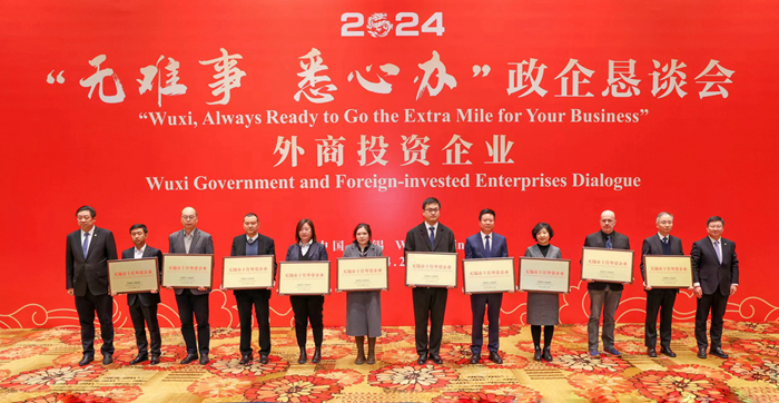 為廣泛聽取企業意見建議,持續打響“無難事 悉心辦”優化營商環境品牌,2月23日,無錫市政府邀請近30家在錫重點外資企業代表召開懇談會,面對面傾聽企業訴求和對政府工作意見建議,并為“無錫市十佳外資企業”頒獎。我司榮獲該項殊榮,集團黨委書記張宏飛代表企業參加會議并交流發言。