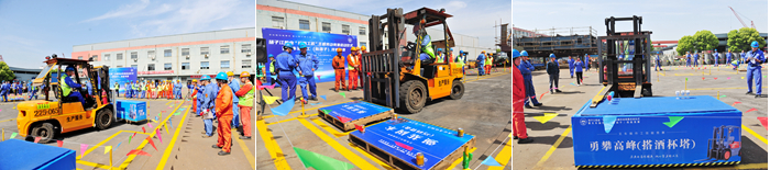 啟動(dòng)儀式后,來(lái)自新?lián)P子造船9個(gè)車(chē)間/部門(mén)舉薦的18名叉車(chē)工參加了首場(chǎng)技能競(jìng)賽。叉車(chē)工競(jìng)賽項(xiàng)目為勇闖四關(guān)。四關(guān)是指實(shí)干篤行(過(guò)S彎道)、強(qiáng)基固本(巧碼貨盤(pán))、專業(yè)精進(jìn)(寬物進(jìn)窄門(mén))、勇攀高峰(搭酒杯塔),項(xiàng)目是對(duì)參賽選手綜合能力的考驗(yàn),要求做到“快、巧、準(zhǔn)、穩(wěn)”,即快速通過(guò)障礙、叉運(yùn)寬物進(jìn)窄門(mén)、精準(zhǔn)堆放貨盤(pán)、平穩(wěn)搭建杯塔。